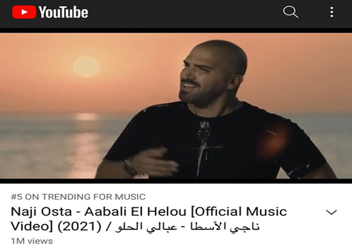 أصدر النجم ناجي الأسطا أغنيته الجديدة بعنوان “عبالي الحلو” عبر قناته الرسمية على الـ Youtube متخطياً المليون مشاهدة خلال أيام، وما زالت الأغنية تحتلّ المرتبة الخامسة على ترند الموسيقى العالمية على اليوتيوب، محققة تفاعلاً كبيراً على السوشيال ميديا.