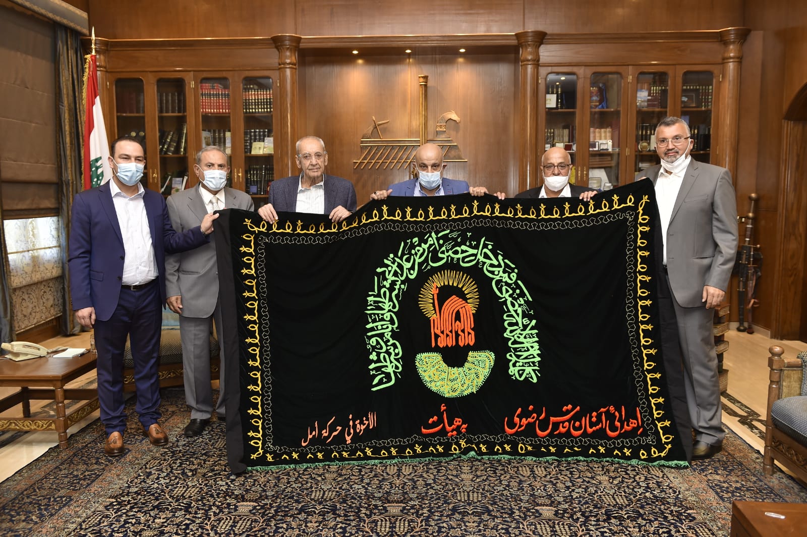 كما سلم الوفد الرئيس بري الهدية التي حملته اياها امانة العتبة الرضوية في مدينة مشهد المقدسة وهي عبارة عن راية الامام علي الرضا (ع).