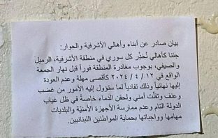 علق مجهولون بيانات مطبوعة على بعض الجدران العامة في الأشرفية تهدد السوريين في مناطق الأشرفية والرميل والصيفي وتدعوهم للمغادرة قبل يوم الجمعة “تفادياً للغضب والعنف والتفلت الأمني ولحقن الدماء”!