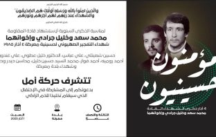 محليات قيادة إقليم جبل عامل في حركة أمل تدعو للمشاركة في ذكرى قادة المقاومة وشهداء تفجير حسينية معركة فبراير 28, 2025 عقدت قيادة حركة أمل في إقليم جبل عامل اجتماعًا لها عشية الذكرى السنوية لاستشهاد قادة المقاومة محمد سعد وخليل جرادي وإخوانهما الشهداء، الذين ارتقوا في تفجير حسينية البلدة من قبل…