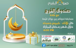 شاركوا بمسابقة “صندوق الفرح” مع غادة واربحوا جوائز نقدية ” كاش”.. كل اثنين وجمعة الساعة 6:00 مساءً عبر أثير اذاعة صوت الفرح وعبر صفحتنا على الفيسبوك sawtalfarah برعاية حلويات البحصلي…