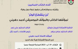 اتحاد الكتاب اللبنانيين يتشرف بدعوتكم إلى حضور ندوة حول رواية: “لن ينقطع الوتر” لمؤلفها الكاتب والمؤلف الموسيقي أحمد دهيني يتحدث فيها : الناشرة الأستاذة ناريمان علوش الناقد الدكتور علي نسر…
